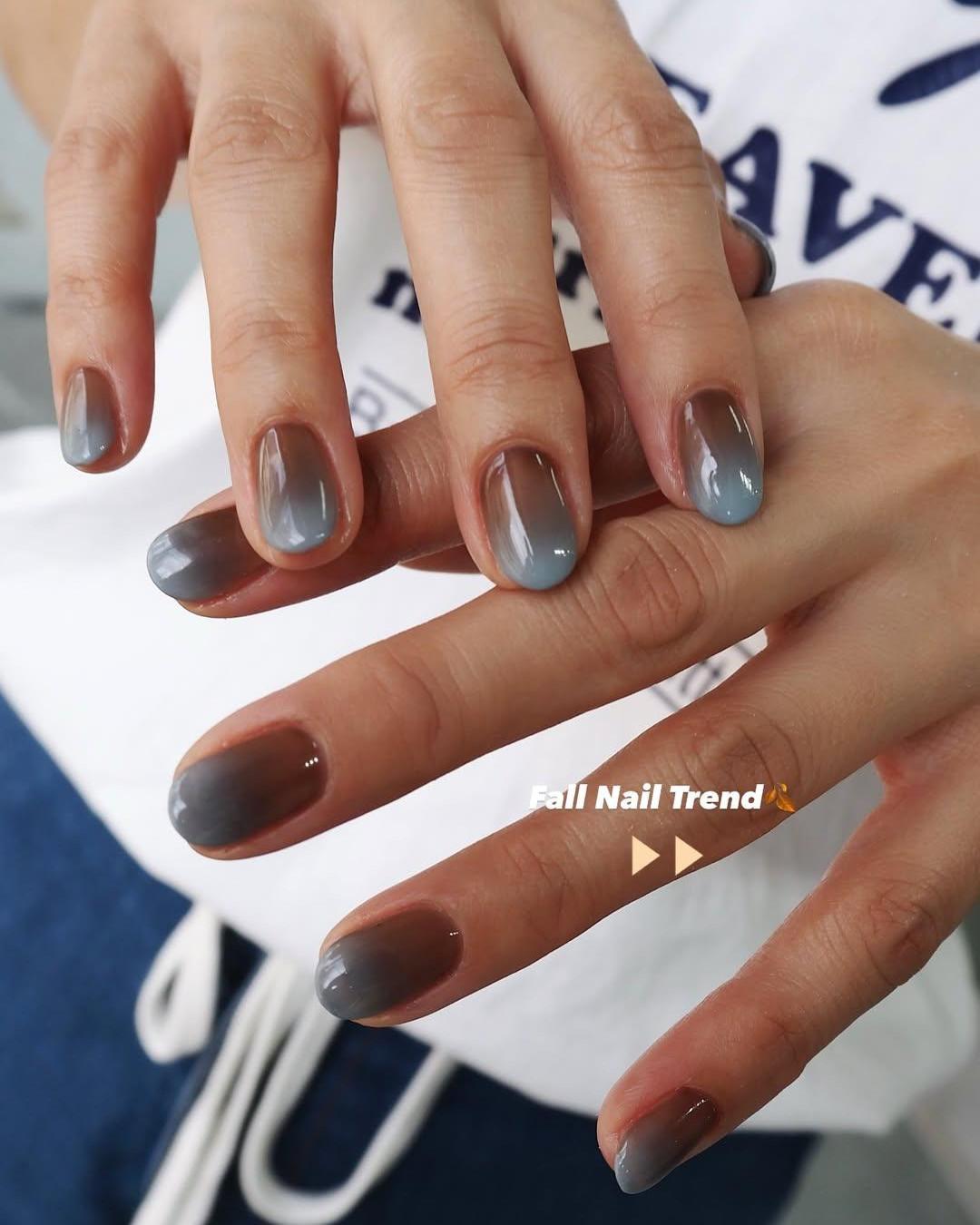 Градиентный френч смотрится очень деликатно. Если блестки с металликом не для тебя, то советую рассмотреть такой вариант маникюра. Переход от неплотного серо-коричневого к голубому на кончиках — изящный выбор. Этот маникюр прекрасно впишется в любые осенние образы в оттенках сезона.