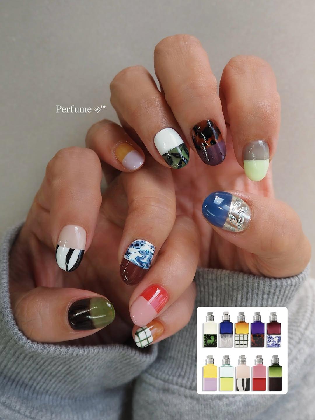 Этот маникюр не похож на классический френч, но японкам нравится делать именно такой вариант. Он вдохновлен дизайнерскими бутылочками парфюма, которые состоят из двух частей с разными рисунками. Поэтому и ты можешь разделить ноготь на две части и на каждой разместить свой узор.