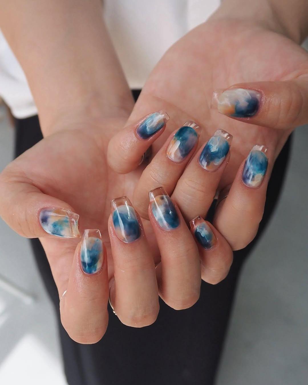 Если ты думаешь, что френч — это про разноцветные кончики, то спешу разочаровать. Иногда французский маникюр может быть прозрачным. Правда, для этого нужно иметь наращенные ногти. На ногтевой пластине нарисуй что-то красивое и акварельное в синем, белом, коричневом и бежевом цвете. А кончики оставь без лака. Получится смелый и необычный дизайн.