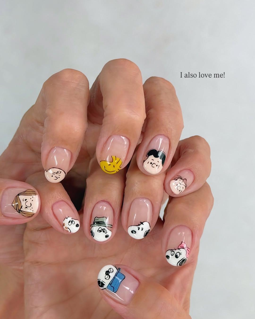 А именно — сделай френч, но белые кончики поменяй на рисунки. Рисуй Снупи в разных луках или дополни маникюр другими персонажами. Мой фаворит — желтая птичка по имени Вудсток.