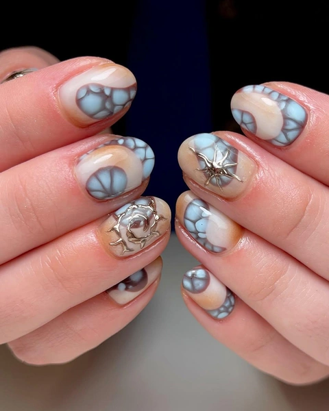 Растекающийся рисунок с помощью гель-лака создать очень просто. Для этого тебе нужна специальная база, которая и делает этот эффект. Сначала нанеси цвет, который будет основным, и просуши его. А потом аккуратно нанеси эту особую базу. Поверх аккуратно размести точки лака, которые легко растекутся в нужный дизайн. Когда результат будет радовать полностью, отправляй руку в лампу. Если использовать нежную коричнево-голубую гамму, то получится очень свежо!