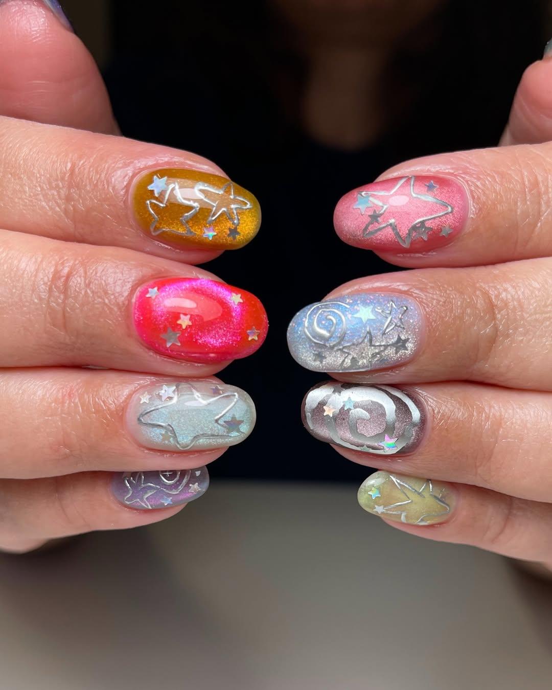 Во-вторых, украшай ногти рисунками звезд и спиралей. Получится очень необычно! А в-третьих, дополни свой маникюр кусочками глиттера в виде небольших звездочек.