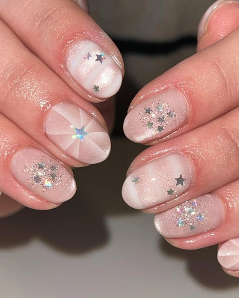 Ну а в этом дизайне ногтей акцент сделан на нежном молочно-розовом цвете, но дизайн все равно выглядит очень стильно, а не просто нежно. Можешь использовать самые разные материалы и техники! Например, розовый пусть будет с популярным эффектом «кошачий глаз» с деликатными блестками. Молочный лак наноси в градиентных техниках. А глиттер пусть будет крупным и в виде звездочек.