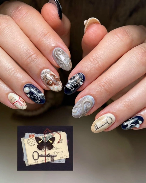В этом маникюре — вся весенняя романтика. Вдохновиться предлагаю эстетикой переписки возлюбленных из XIX века. Используй в маникюре бежевый оттенок слегка пожелтевшей бумаги и темно-синий цвет чернил. Рисуй бабочек, ключи, буквы и завитки. А украсить всю эту красоту можно жемчужными стразами.