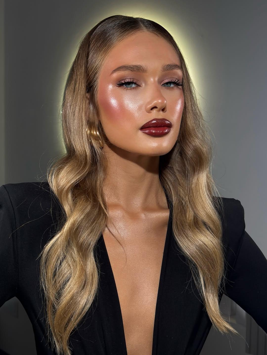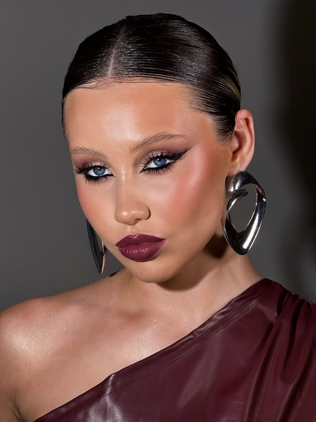 Наноси помаду уверенно, одним точным движением, чтобы подчеркнуть всю глубину и яркость оттенка. Чтобы не перегрузить образ, сделай ставку на сияющую кожу и выразительные стрелки.