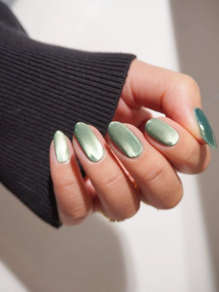 Зеленый «кошачий глаз» — самый главный герой сезона. Нежный оттенок делает этот маникюр самым весеннем из этой подборки, а перелив сияющего блика добавляет ему роскоши. Если ты хочешь чего-то нестандартного, но дорогого и носибельного, то выбирай этот вариант.