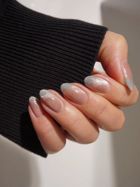 Нюд всегда смотрится дорого. Даже если его сделать блестящим. В этом сезоне лучшим вариантом блесток будет эффект «кошачий глаз». Легкое мерцание блика, которое меняется в зависимости от освещения, добавляет глубину даже самому нейтральному оттенку. Выбирай бежевые или нюдовые «кошки». А если захочется сделать интересный акцент, то серый френч красиво дополнит маникюр.