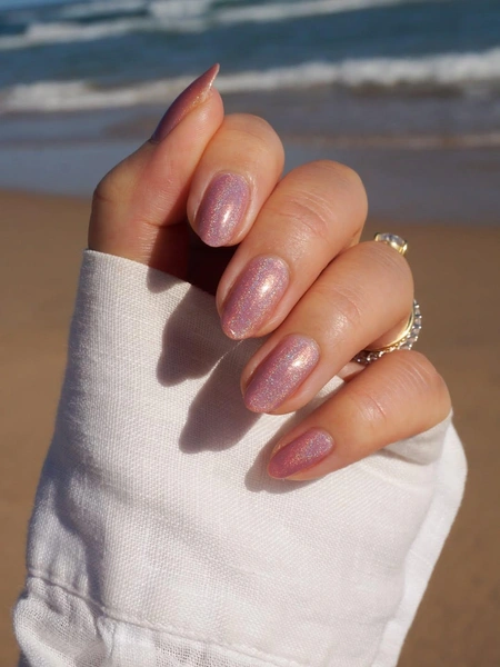 Если хочется чего-то более игривого, светлого и женственного, то голографический розовый твой вариант. В отличие от классического глиттера, голографические блестки дают многослойный эффект, потому что они переливаются всеми цветами радуги под ярким светом. А в обычном освещении маникюр выглядит нежно и деликатно. Так что если хочешь сделать дорогой блестящий маникюр, выбирай голографию.