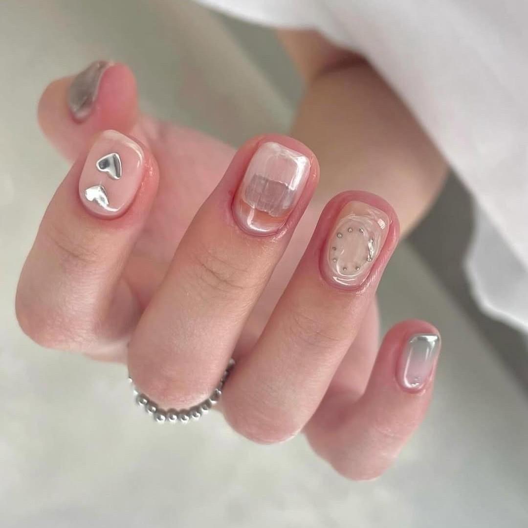 Этот маникюр в подборке самый нежный. Перламутровый акварельный маникюр — это дизайн, где цвет почти неуловим, а сияние играет главную роль. Дополни изящные серебристые разводы другими рисунками: деликатным градиентом, сердечками и объемным гелем с бульонками.