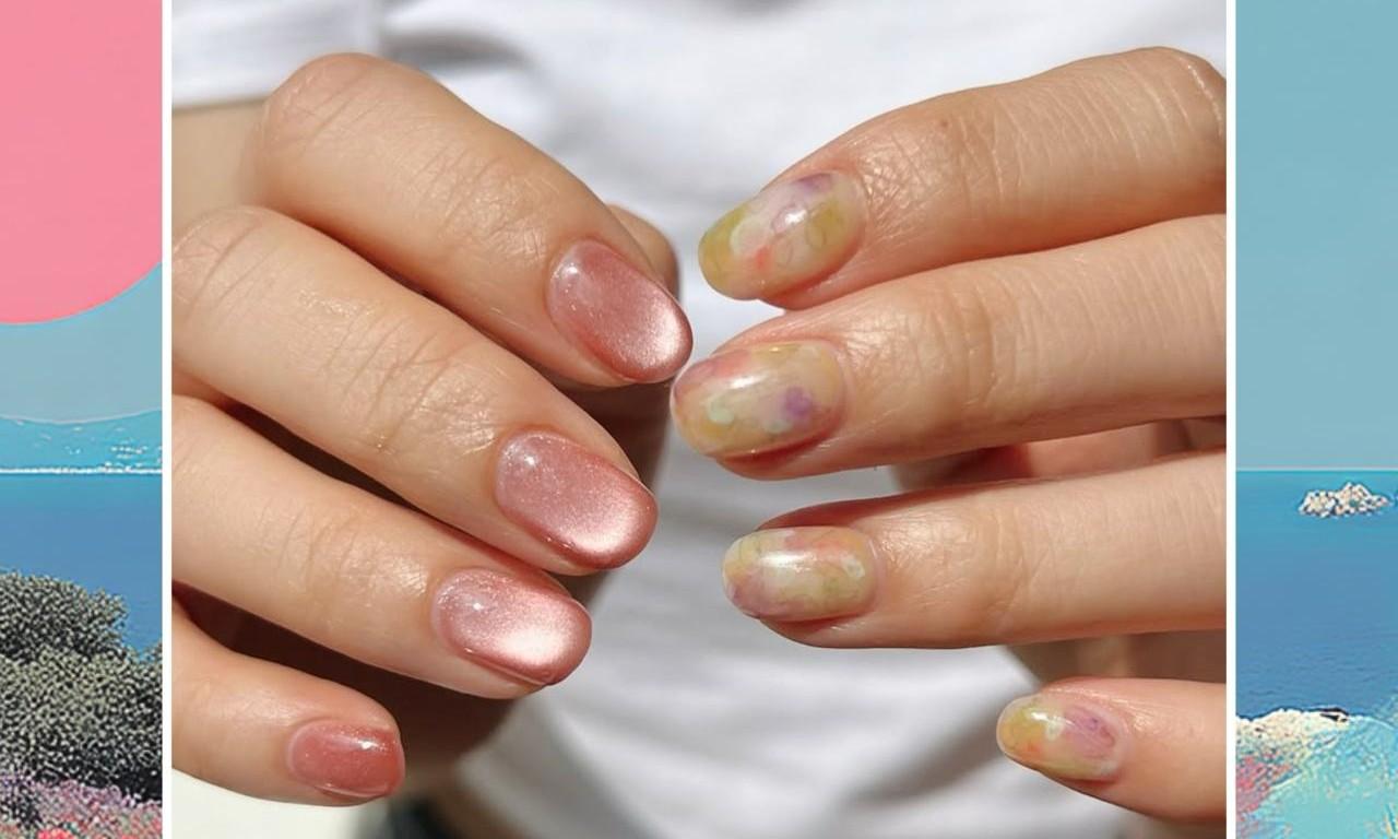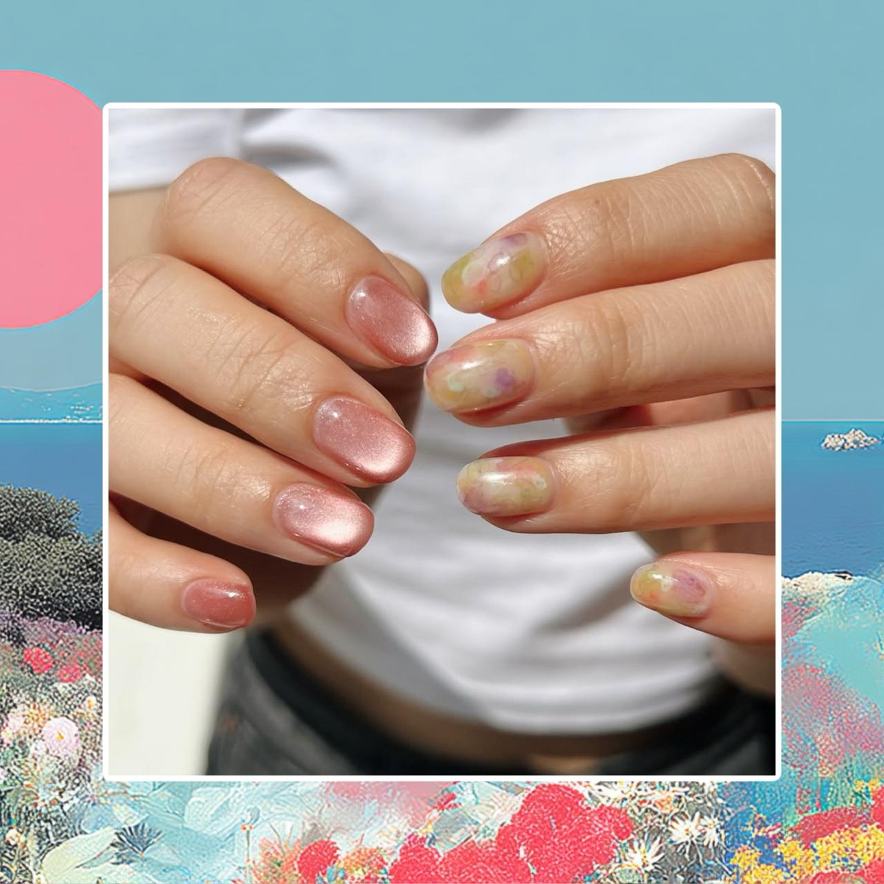 На одной руке сделай нежный маникюр с эффектом «кошачий глаз» в розовом оттенке. А на другой пусть будет нежный акварельный дизайн в цветочном стиле с яркими пятнами розовыми, оранжевыми и фиолетовыми на салатово-зеленом фоне.