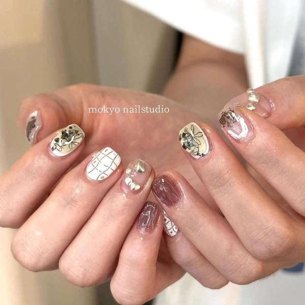 Самый творческий вариант маникюра! Каждый ноготь тут — отдельная миниатюра. На одних делай акварельный дизайн, на других — клеточки, остальные украшай цветочками, стразами, объемным гелем. Получится очень нарядно, если соблюсти цветовую гамму.