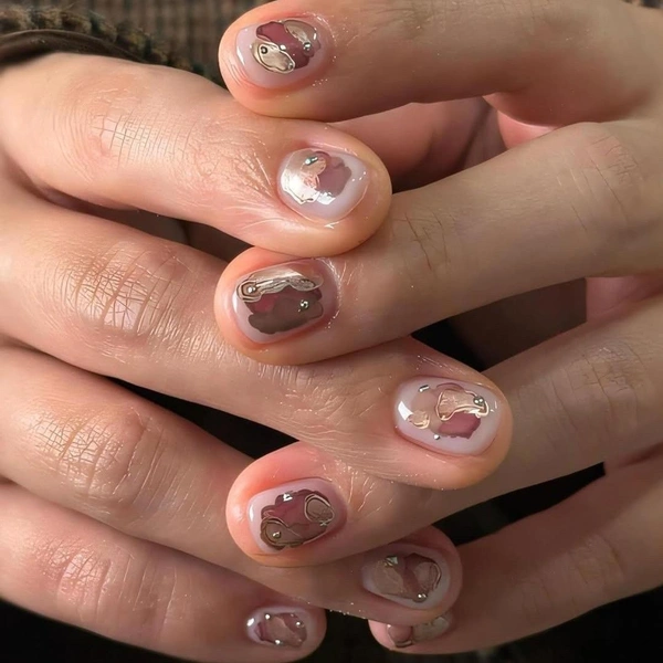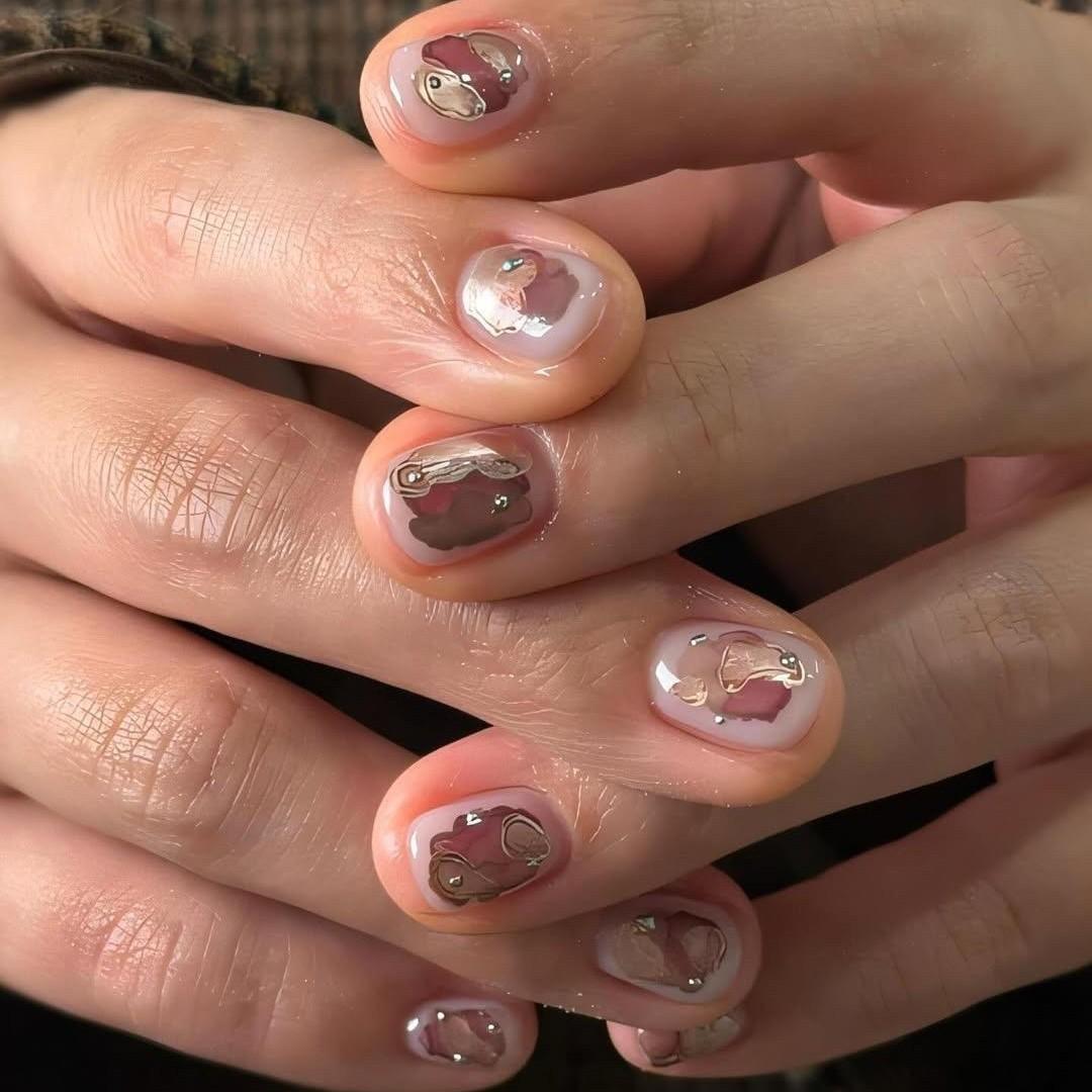 Коричневый — не самый очевидный выбор для весны, но в акварельной технике он смотрится очень нежно. Воздушный, с оттенками карамели, бежевого и кофе с молоком, он будет дополнять любой весенний образ. Тебе нужно лишь нарисовать три пятнышка в центре ногтя и украсить их бульонками.