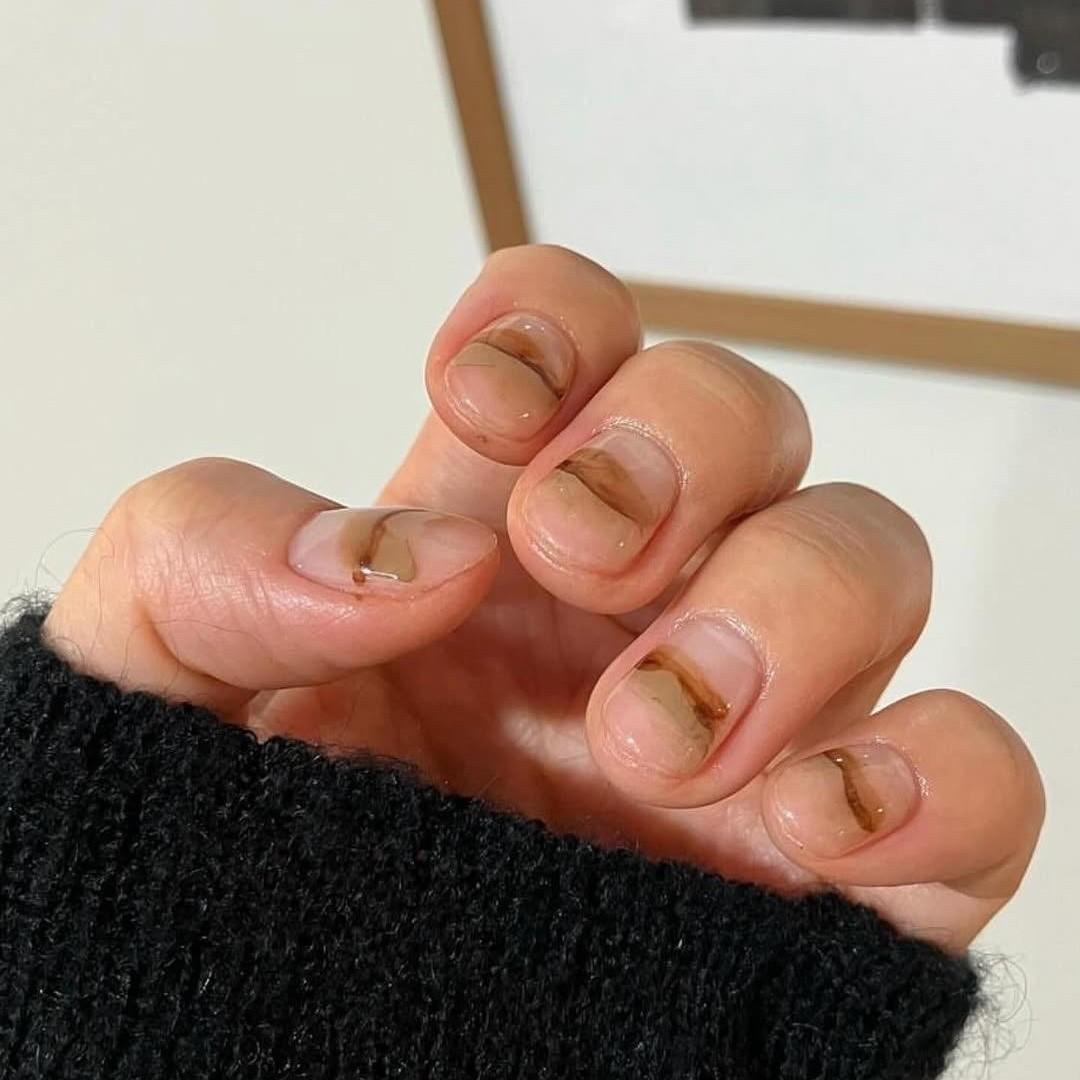 В этом маникюре сливаются два красивых кофейных цвета — прозрачный оттенок разлитого эспрессо и нежный тон латте. Сделать такой дизайн проще простого, если у тебя есть кисточка и краски подходящих цветов. Сначала нарисуй полоску темной акварели, а потом, поверх, более светлой.