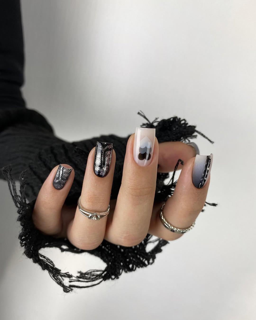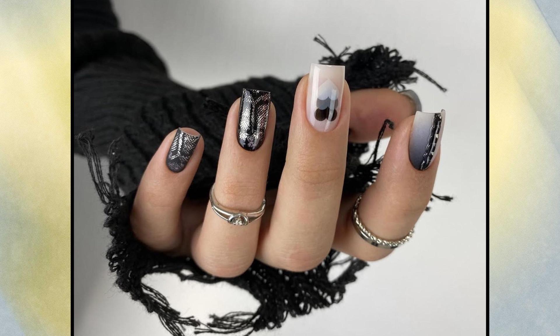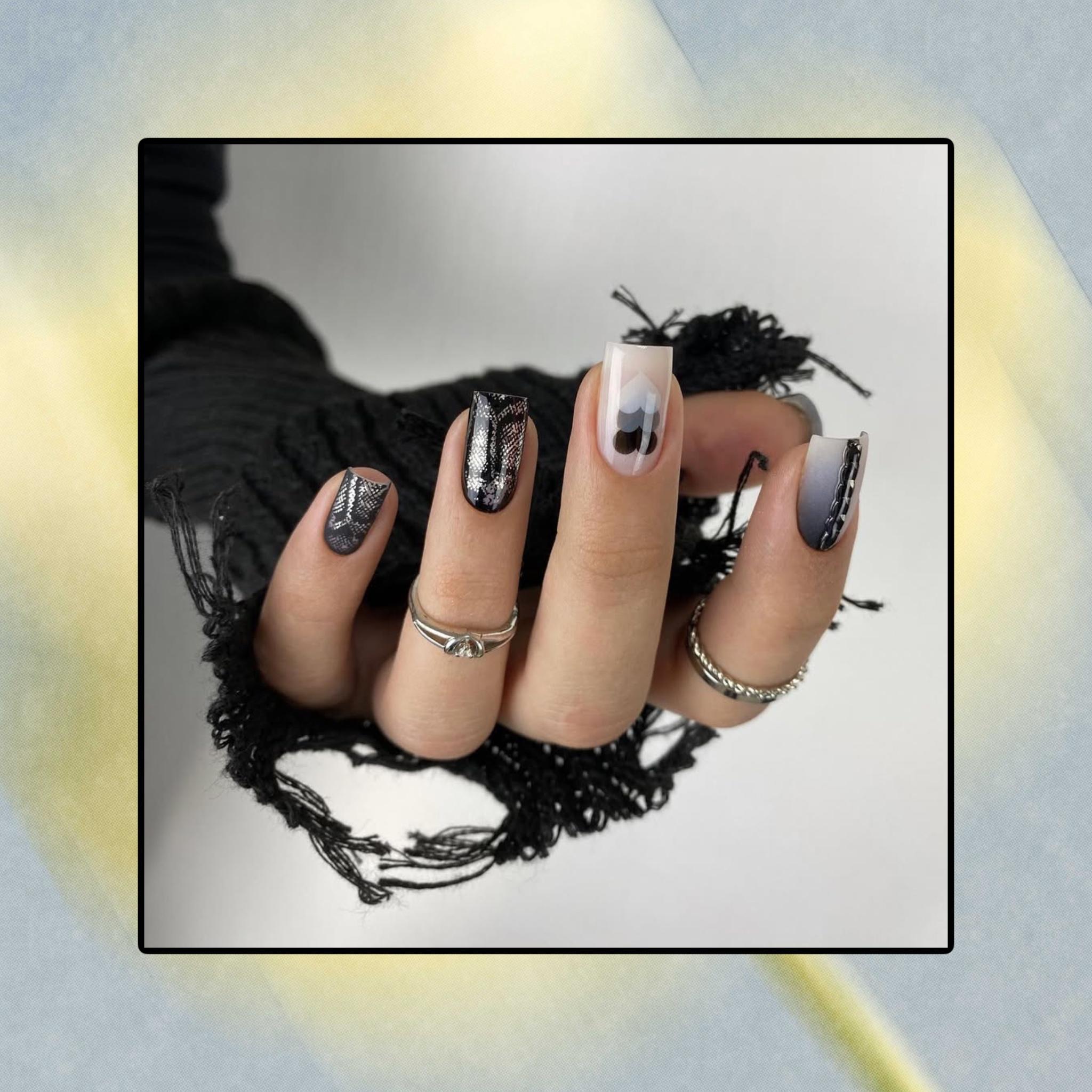 Два ногтя укрась узором, имитирующим змеиную кожу в черном и серебристом цветах. А на среднем пальце — светлый фон с узором из черных, серых и белых сердечек разного размера. А также не забудь про небольшие черные точки и красивый вертикальный градиент. Такой маникюр будет идеальным вариантом для дерзкого зимнего образа.