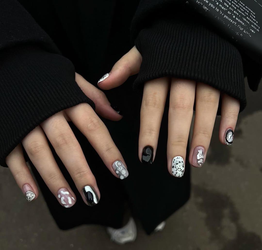 На некоторых ногтях сделай абстрактный узор, напоминающий разводы или мраморные прожилки в оттенках серебристого, черного и белого. На других ногтях — графичные элементы: один ноготь полностью черный, а на другом — белые точки на черном фоне, которые имитируют пятна. Один палец сделай с белым фоном с черными абстрактными элементами, напоминающими объекты. Включай фантазию и создавай!