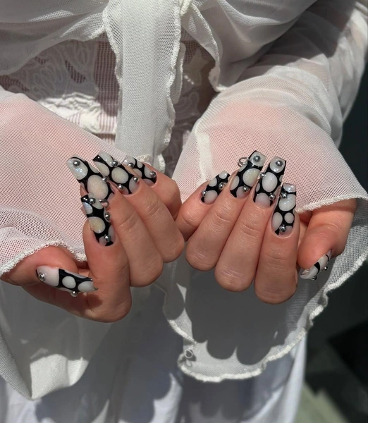 Каждый ноготь украшай чередующимися белыми и черными кругами разного размера. Поверх дизайнов расположи серебристые металлические детали, которые могут быть бусинами или заклепками. Они добавят объем и текстуру, а еще напомнят о пирсинге, который в маникюре сейчас очень актуален.