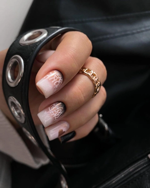 Черно-белый маникюр с квадратной формой ногтей выглядит очень эффектно. У основания ногтя сделай градиент от черного к белому, переходящий в белый френч. Белым цветом сделай надпись, которая напоминает иней или кружево. На одном безымянном пальце нарисуй коричневое сердечко. Такой маникюр идеально подойдет для любого образа!