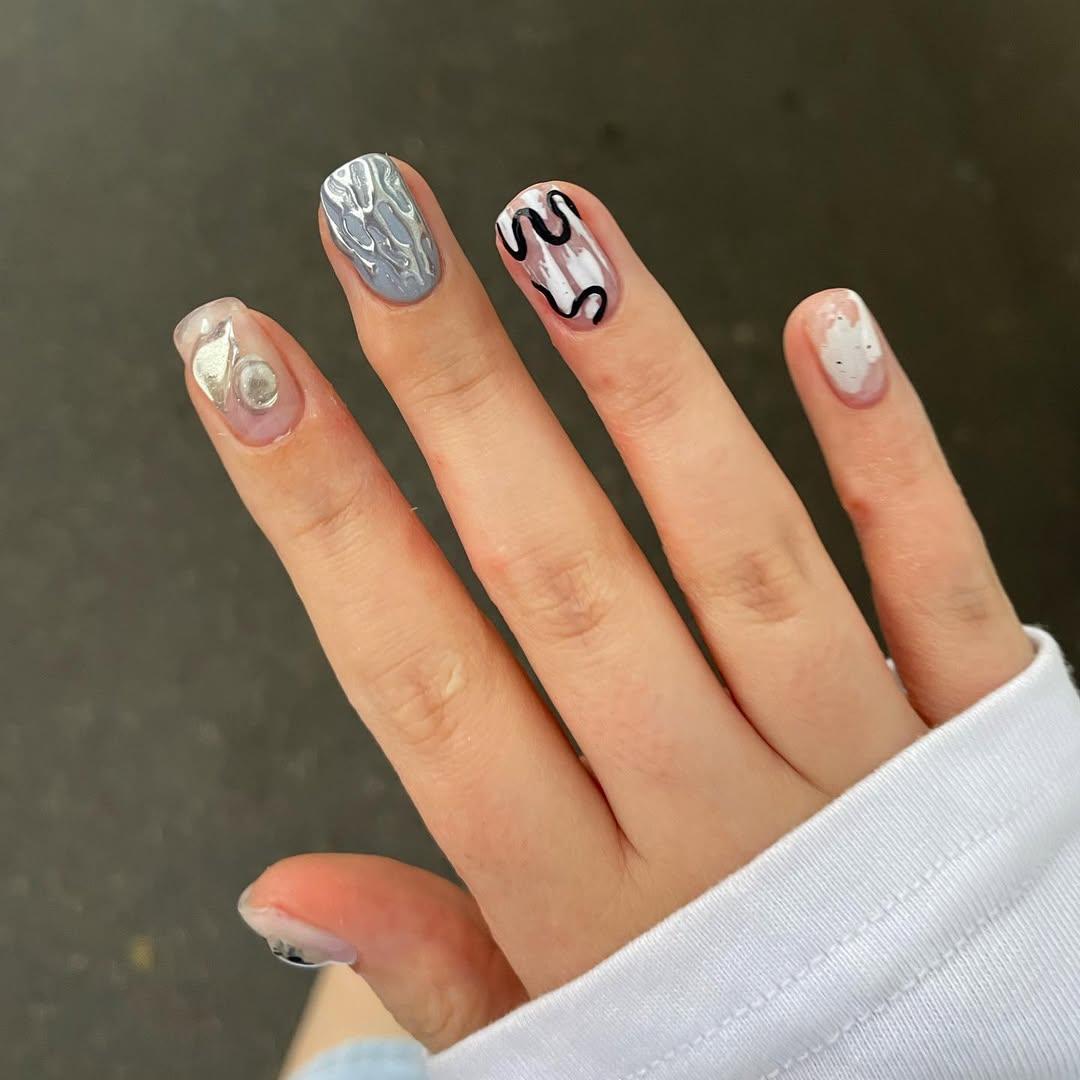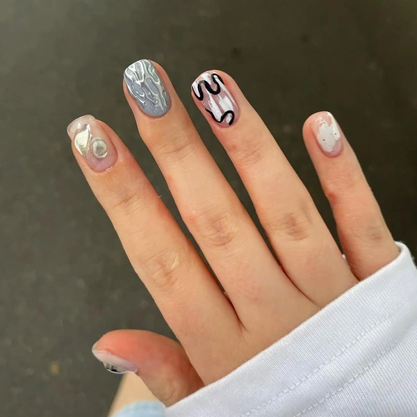 Маникюр с минималистичным дизайном, в котором ногти могут быть с короткой длиной и мягкой формой. На одном ногте сделай прозрачное покрытие с серебристыми объемными элементами. На другом ногте — серебристо-серый фон с абстрактными разводами, которые добавят нужную текстуру. Еще один ноготь покрой прозрачным лаком и украшай нарисованными черными волнистыми линиями. На следующий нанеси полупрозрачный белый лак с мелкими блестками, напоминающими конфетти.