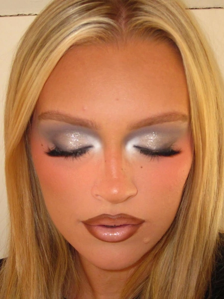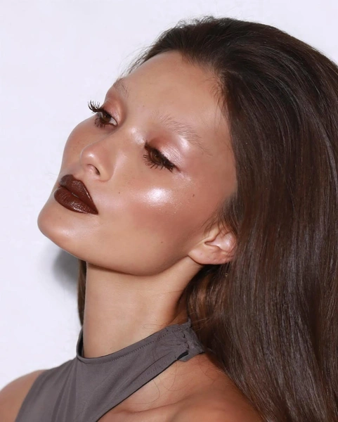 В качестве базового оттенка выбери теплый оттенок, а уже после добавь более темный во внешний уголок глаза, вытянув дымчатую стрелку. Нанеси тени с шиммером на подвижное веко (их можно заменить ярким хайлайтером). Добавь ягодный блеск и несколько пучков ресниц к этому образу!