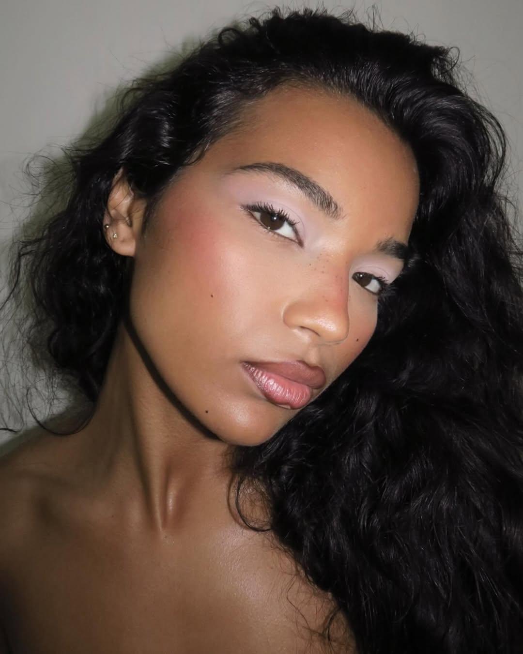 Лавандовый CC-крем — один из самых популярных цветов в бьюти-индустрии. Если ты изрядно устала от эстетики clean girl, а дерзкие смоки не прельщают, на помощь приходят сатиновые бледно-фиолетовые тени. Чтобы продукт не скатался на веках, подготовь кожу с помощью праймера или увлажняющего крема вокруг глаз.