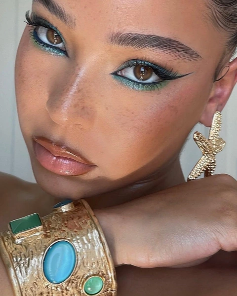 Не отходя от русалочьей эстетики, смотри более яркий макияж с активным зеленым оттенком. Для начала нужно растушевать темно-коричневый теплый цвет, доходя до верхнего века: для этого случая подойдет твоя любимая контурирующая пудра. После уже можно приступить к изумрудному оттенку.
