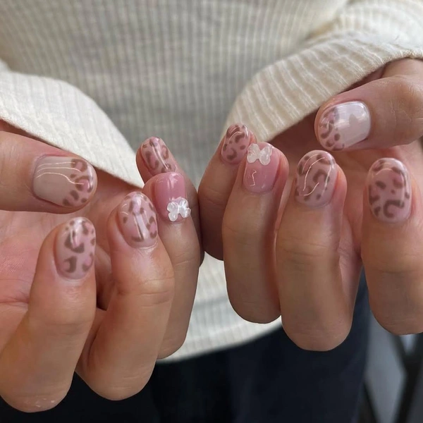 Но если очень хочется примерить бежевый, то сочетай его с розовым лаком. База пусть будет светлая, оттенка кофе с молоком. Очертания пятен леопарда нарисуй коричневым лаком. Оттенок выбирай не слишком темный, чтобы результат выглядел нежно. А серединки покрой розовым цветом. Можешь также украсить ногти объемными бантиками и френчем.