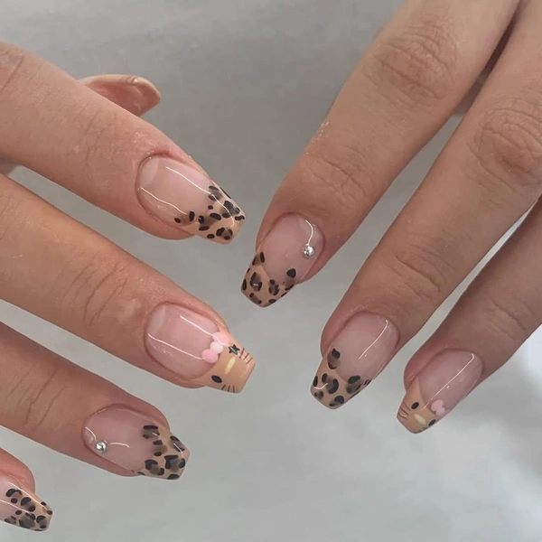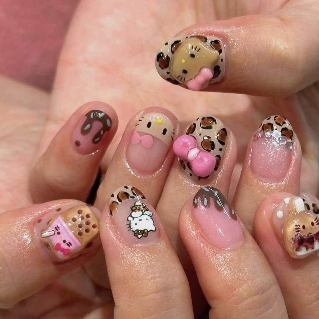 Французский маникюр можно нарисовать и более классический, но украсить его стоит леопардовым принтом. А на паре акцентных ноготков нарисуй мордочку Hello Kitty с глазками, носом и усиками. Если хочешь, добавь еще и милый бантик!