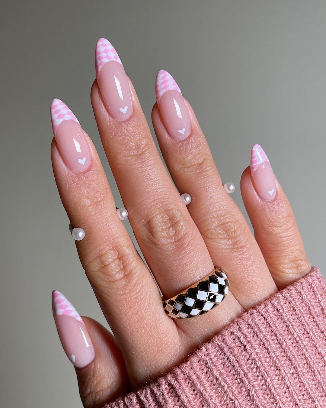 Классический френч может получить геометрическое обновление. На традиционной белой улыбке нарисуй паттерн из ромбов или клетки. Рисунок делай тонкой кистью, но если есть возможность, пользуйся стемпингом или слайдерами. Базу выбирай светло-розовую, полупрозрачную. Такой френч выглядит свежо и современно. Если ты устала от сердечек и прочей классической валетиновской эстетики, то смело выбирай этот вариант.