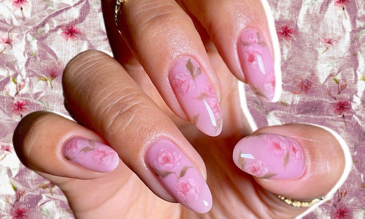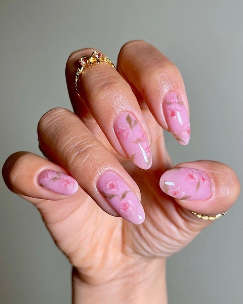 Розы на ногтях — это вечная классика романтичного маникюра, но в этом году они стали более художественными. Сейчас актуальные не обычные наклейки, а нарисованные розы с детальной прорисовкой лепестков, тенями и бликами. Но и наклейки никто не запрещает, если ты найдешь подходящие. Покрой ногти светло-розовым лаком, а поверх нарисуй цветы — готово! Реалистичные розы требуют навыка, но результат выглядит как миниатюрная картина из музея.