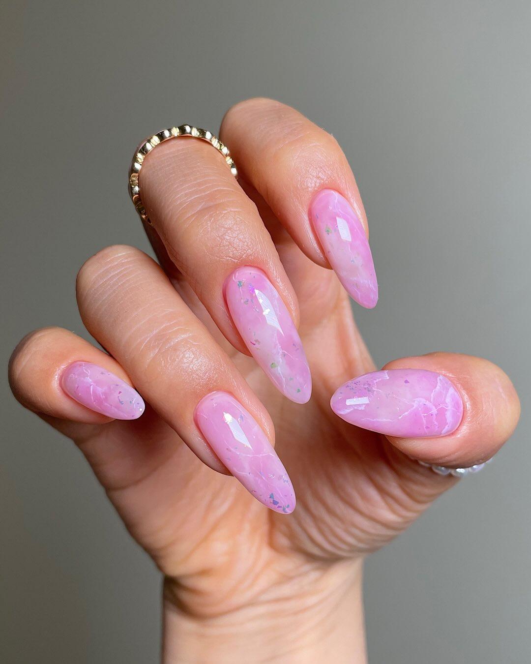 Мраморный эффект создается смешиванием нескольких оттенков розового с добавлением белых прожилок. Цвета аккуратно наслаиваются, создавай характерные разводы, как в натуральном мраморе. Техника выполнения может варьироваться: одним удобнее создавать мраморный эффект, опуская ноготки в стакан воды с лаками (такая техника называется water marble), а другим нравится работать кисточками. Добавь топ с опаловыми хлопьями для большей изящности дизайна.