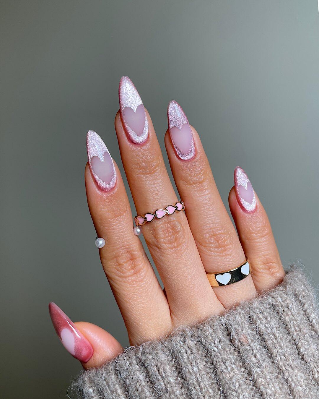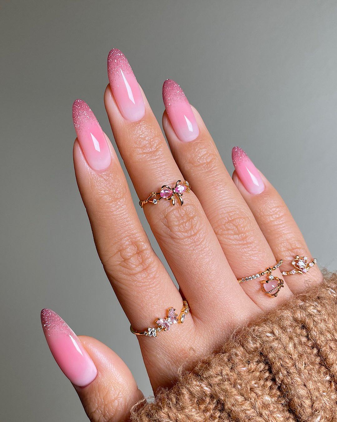 Это многослойный дизайн, который сочетает сразу несколько трендов. База — молочная с розовым градиентом в виде ауры. Поверх этого — френч с градиентом: кончик ногтя покрыт блестящим розовым глиттером с мягкой растяжкой. Это красивый дизайн, который напоминает о Дне святого Валентина, но без розочек и сердечек.