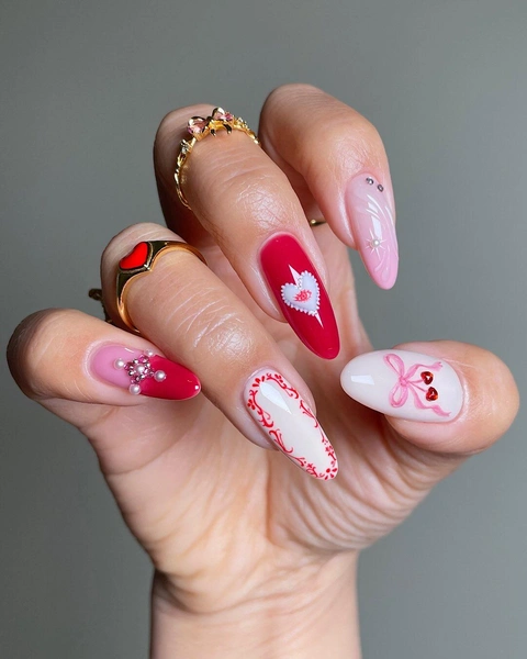 Почему выбирать один дизайн, если можно попробовать все сразу? Так ты можешь совместить в одном маникюре все, что хочется. Два пальца покрой молочно-бежевым лаком и нарисуй на одном ажурную рамку, а на другом — розовым бантик с красными вишнями. Еще один ноготок укрась красной базой с белым сердцем в центре.