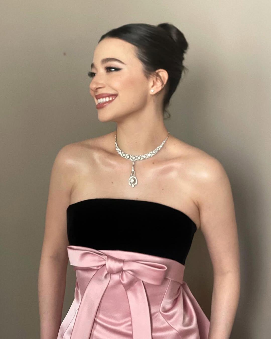 Майки Мэдисон знает толк в легких, но классных прическах. Например, самый лаконичный и эффектный вариант — пучок с пробором посередине. Для начала собери невысокий небрежный хвост: после расчеши волосы, направляя их к вискам.