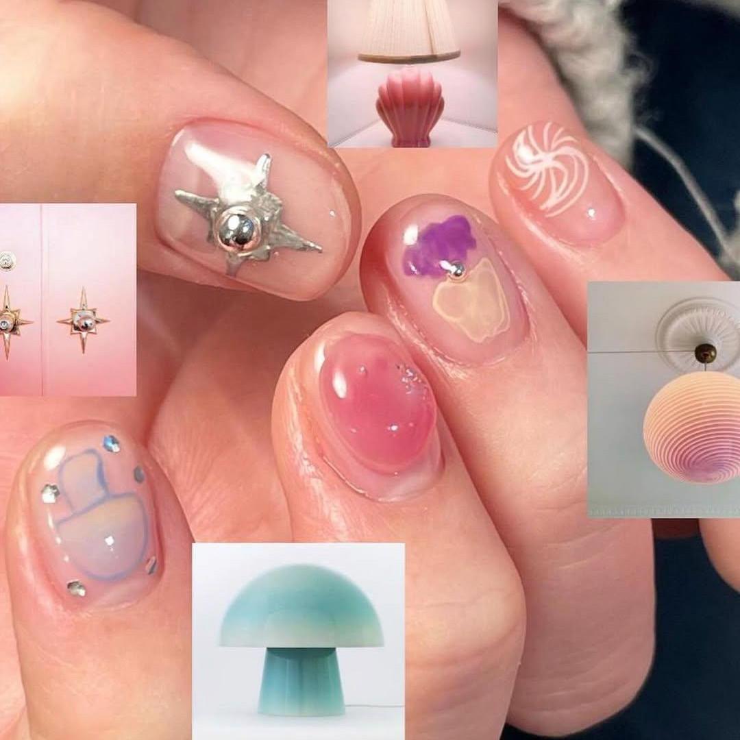 Начну с самого неожиданного — маникюра, имитирующего пастельные плафоны прикроватных ламп. Это нежные полупрозрачные оттенки: молочно-белый, светло-персиковый, розовый, мятный. На паре ногтей можно нарисовать сами лампы. Она пусть будет акварельной и слегка небрежной, а другую рисуй ручкой, стараясь сделать акцент на контуре. Остальные же ногти украшай другими комплиментарными дизайнами. Этот маникюр идеален для тех, кто хочет что-то необычное, но при этом сдержанное.