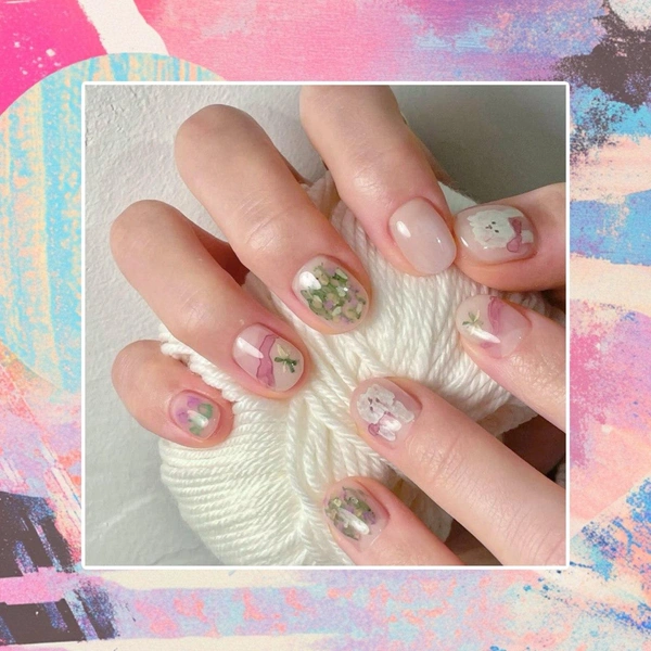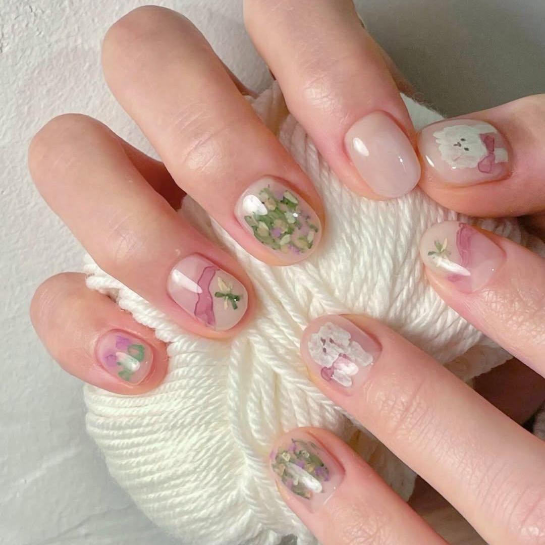 Милые иллюстрации — визитная карточка корейского нейл-арта. Очень красиво на ногтях смотрятся маленькие кролики в сочетании с зеленью — листиками, травинками, веточками. Это отсылка к весне, пробуждению природы, свежести. Кроликов рисуй схематично, почти в мультяшном стиле. А зелень создавай пятнами, будто на полотне художника-импрессиониста.