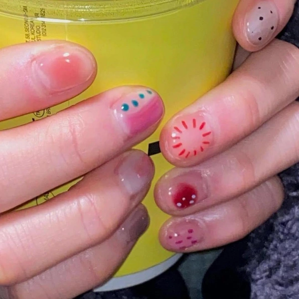 Розовый — вечная любовь корейской бьюти-индустрии, и этой весной он переживает очередной пик популярности. Но выбирай для своего маникюра не один оттенок, а всю гамму сразу. Цвет Барби, пыльная роза, нюд, почти красный цвет — актуально сразу все. А рисунки в дизайне могут быть абстрактными. Например, красиво смотрятся любые точки и пятнышки в контрастных оттенках.
