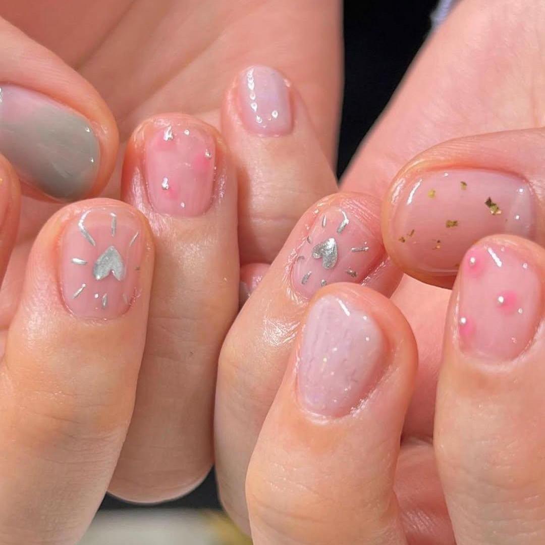 Прозрачная база с металлическими акцентами — квинтэссенция корейского минимализма. Ногти покрой прозрачным или едва заметным нюдовым оттенком, а декор создавай с помощью тонких золотых и серебряных элементов. Можешь нарисовать на паре ноготков серебряные сердечки, еще один палец украсить миниатюрными кусочками золотой потали, а следующий задекорировать бульонками. Остальные ногти пусть будут без блеска.