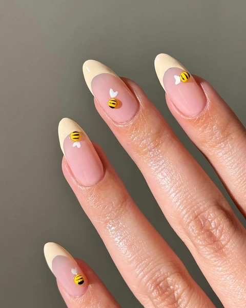 Еще один трендовый вариант — французский маникюр в цвете сливочного масла. Всем казалось, что он исчезнет через пару сезонов, но не тут то было. Здесь важно подобрать нужный оттенок: если же его нет под рукой, смешай белый и желтый. Кстати, о последнем — он пригодится тебе для декоративных пчелок. Их можно создать с помощью того же 3D-геля. Просто сформируй несколько миниатюрных шариков и добавь полосы черным лаком. Несколько последних штрихов, и ты готова к солнечному путешествию!