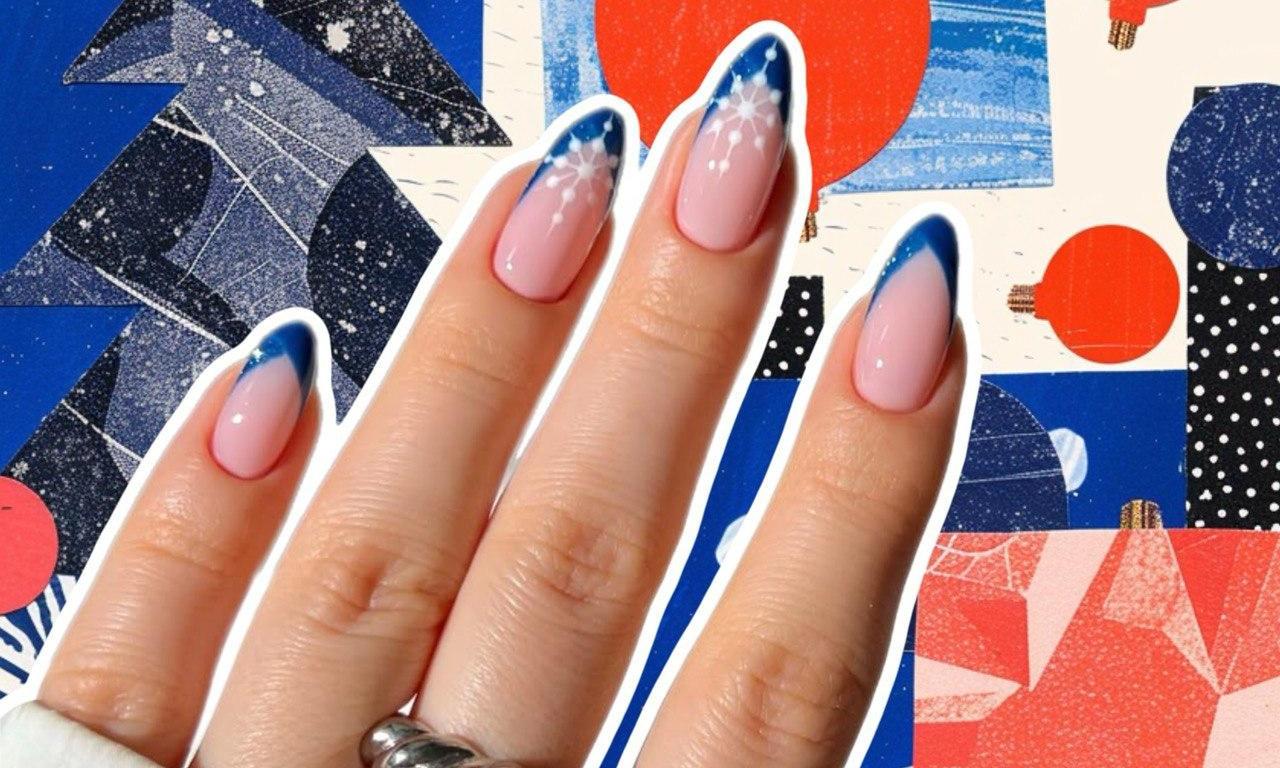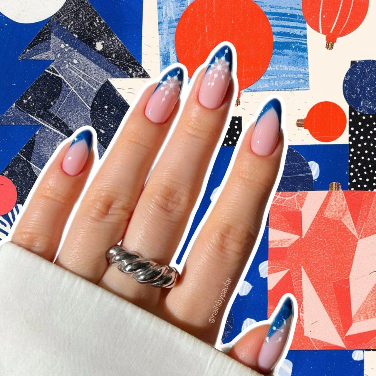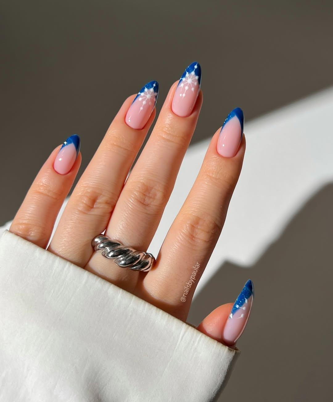 Французский маникюр бывает не только классическим: я нашла классный вариант в зимней эстетике. Тем более в актуальном синем цвете — как не поддаться такому искушению? Правда, френч здесь не совсем базовый: линии не округлые, а будто пересекаются друг с другом в форме буквы V. Используй два вида лака — блестящий и простой глянцевый. Именно с помощью первого ты добьешься красивого сияния! Не забудь добавить пару снежинок с помощью дотса и тонкой кисти.