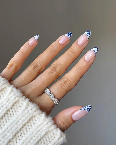 Искусство не заканчивается на галерея и картинах: его можно увидеть даже в нейл-арте. Например, с Гжелью — казалось бы, просто невозможное сочетание, но оно имеет место быть! Просто вооружись ярким синим цветом, присущим этой исторической росписи. Обведи яркими точками френч, нарисовав на отдельных ноготках узоры, напоминающие лепестки цветов. Только будь аккуратнее: велик шанс ошибиться и размазать рисунок. Покрой ногти топом и поспеши поделиться крутым результатом со своими подружками.