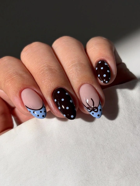 Горох проникает не только в наши гардеробы, но и в нейл-индустрию. Кажется, что без него уже нельзя найти ни одно фото в аккаунте мастера по маникюру: настолько он стал популярен. Он выглядит особенно круто в сочетании с голубым и коричневым — смело и ярко. Безымянный и указательный пальцы оформи в классическом френче, добавив рисунок в виде бантика. Остальные можно покрыть шоколадным лаком для контраста: не без игривых белых точек, конечно!