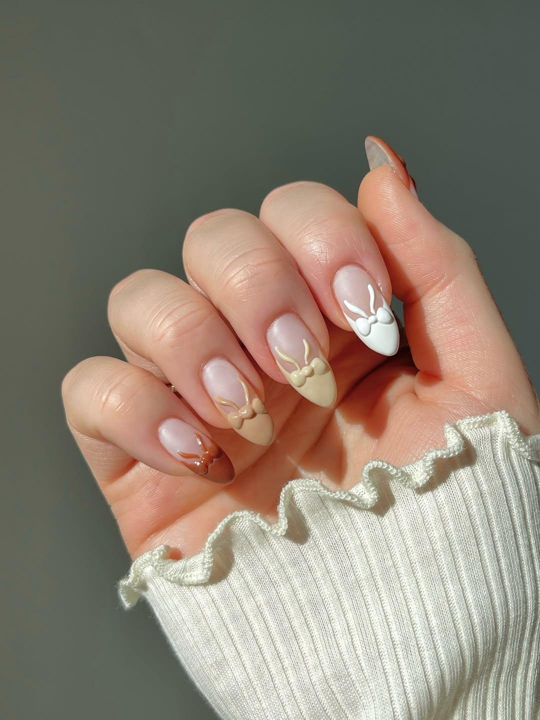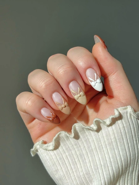 Нежные эстетики никуда не пропали, несмотря на то, что готика может побеждать. Как насчет маникюра с милыми бантиками? Он будет выглядеть классно, если ты сходишь с ума по «мягким» стилям. Здесь есть еще один нюанс: этот нейл-арт выполнен в матовом эффекте. Так что, если у тебя есть специальное покрытие — вперед к свершениям. После рисовки самого френча, добавь банты с помощью 3D-геля, не забывая про ленточки, направленные к кутикуле. Не забудь использовать сразу несколько оттенков нюдового.