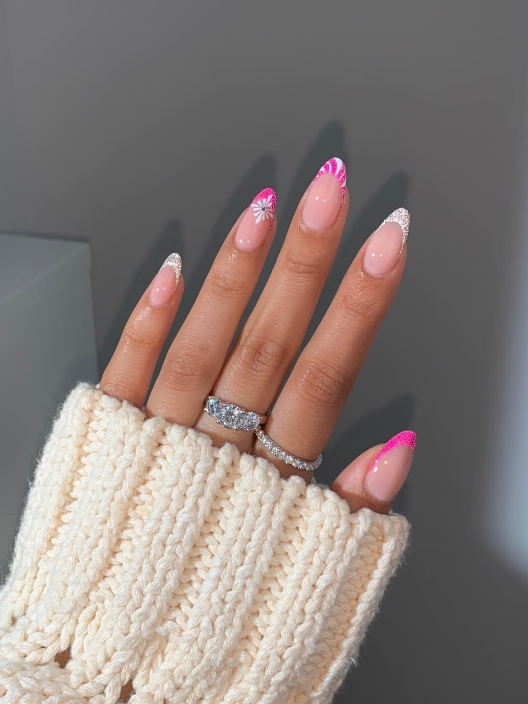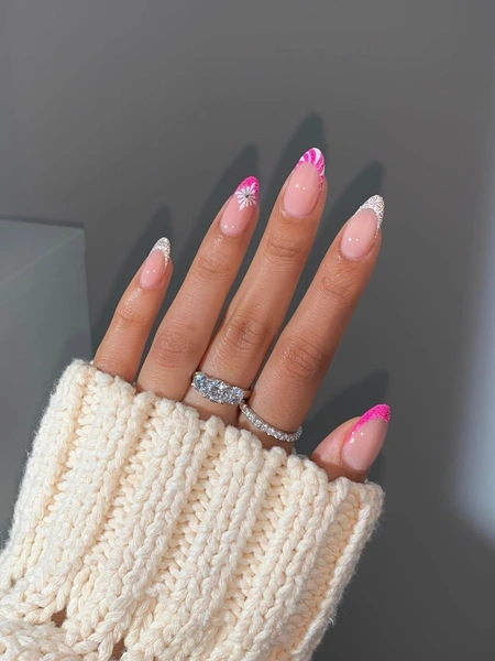 Розовый не может пройти мимо ни одной подборки: это самый классический цвет, который только может существовать. Такая идея точно подойдет тебе, если ты устала от нежных и нюдовых оттенков — нужно добавить красок в твои нейл-арты! Все очень просто: вооружись тонкой кистью, лаками, пурпурными и серебряными блестками. Последние тебе пригодятся, чтобы добавить маникюру сияния: когда ты уже закончишь с френчем, нанеси их поверх для вау-эффекта. Добавь специальную наклейку в тон на безымянный палец в качестве акцента!