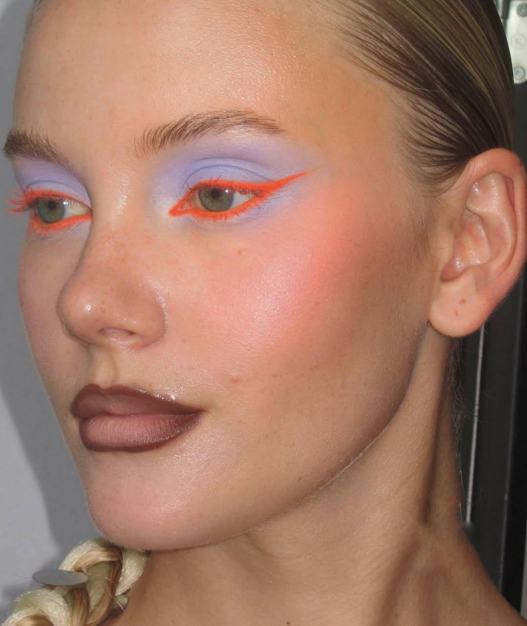 Если же тени в уголке века тебя не совсем устраивают, советую привычный вариант — стрелка, которая доходит до внешнего уголка глаза. Она может быть любого оттенка: как базового черного, так и яркого оранжевого. Кстати, с последним отлично сочетается трендовый лиловый! Правда, есть одно правило: если макияж глаз достаточно насыщенный, другая часть должна быть более спокойной. Теплый контуринг, розовые румяна и бордовое лип-комбо — залог крутого мейка!