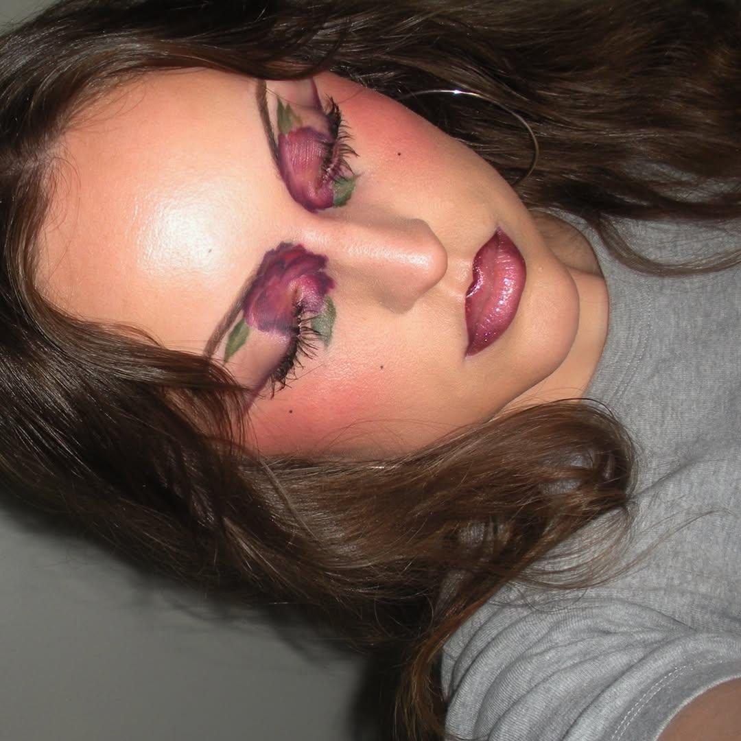 Самая яркая и необычная идея — цветы в уголке твоих глаз. Конечно, если ты умеешь рисовать, это будет большим плюсом. Но можно обойтись и без аквагрима: поищи на маркетплейсах наклейки для макияжа, которые крепко держатся на коже и не позволят твоему образу развалится посреди вечера. К цветам можно добавить длинную стрелку в похожем оттенке — так твои глаза будут выглядеть еще притягательнее. Нанеси черничную помаду и покоряй мир своим загадочным бьюти-образом!