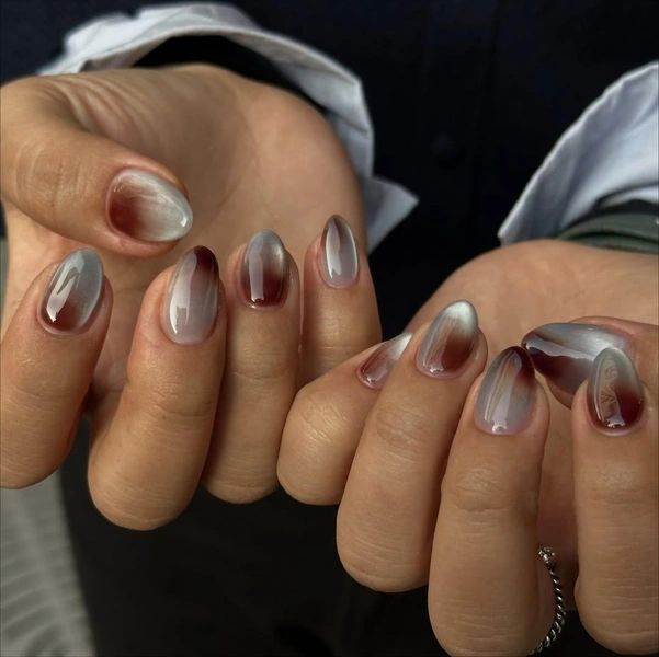 Это, конечно, не анималистичный принт, но такая же яркая идея — акцентные пятнышки на ногтях. Дуэт серого и бордово-коричневого — один из самых удачных и трендовых. Такой дизайн отлично подойдет тебе, если ты уже экспериментировала, например, с горохом: новые изменения не покажутся тебе такими радикальными.