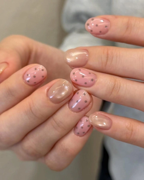 Светло-розовые ногти в коричневый горошек смотрятся очень необычно. Такой маникюр идеально подходит тем, кто любит легкий намек на стиль ретро или просто предпочитает нежность и классику. Разнообразить маникюр можно нюдовым покрытием с эффектом «кошачий глаз». Такой дизайн легко сделать и самой, так что очень советую попробовать!