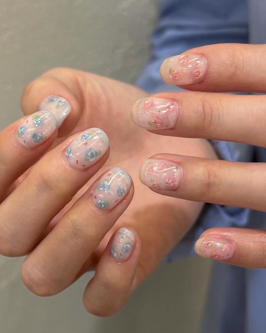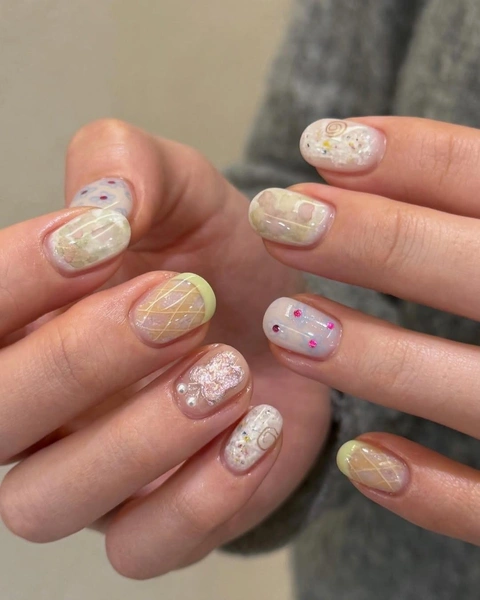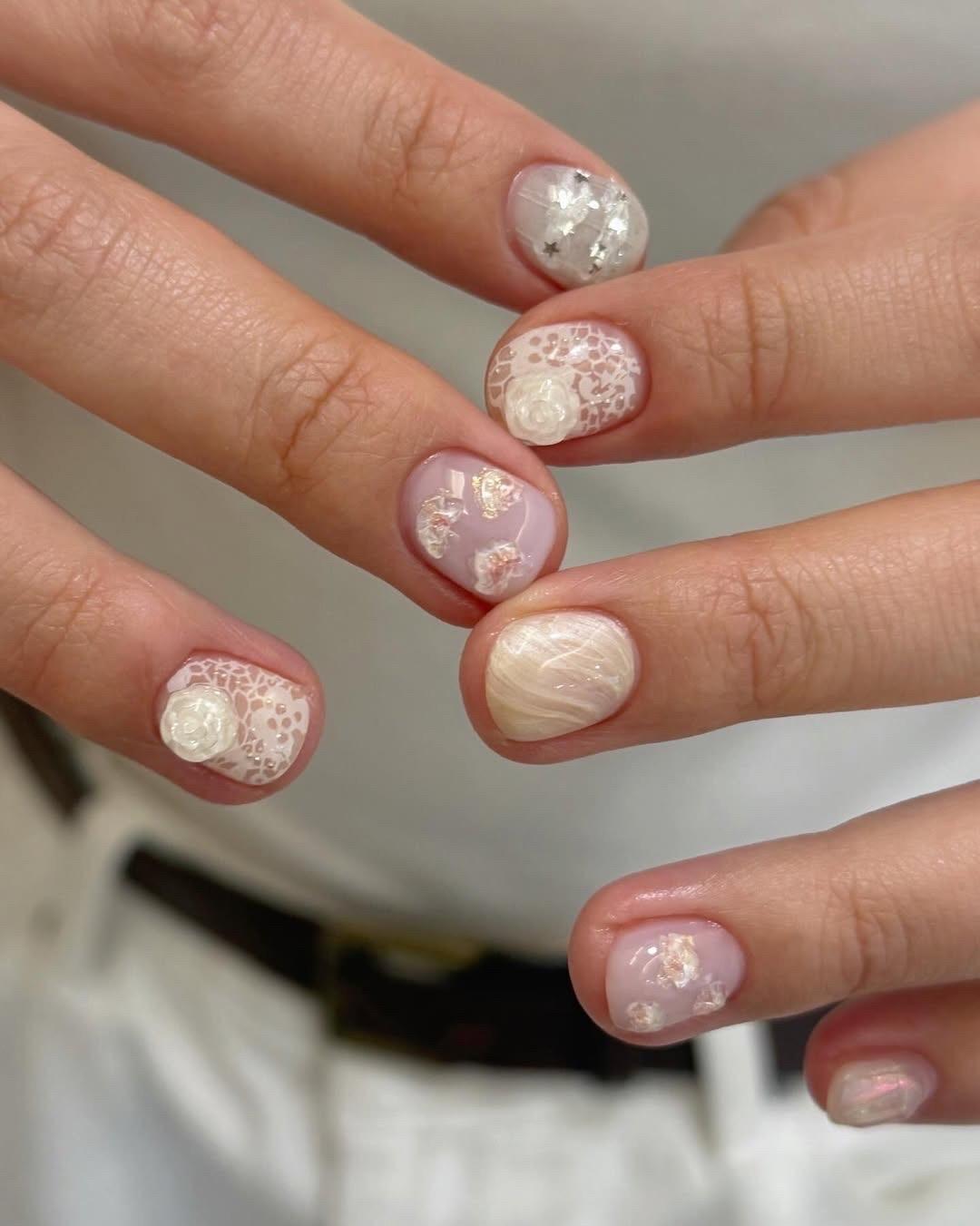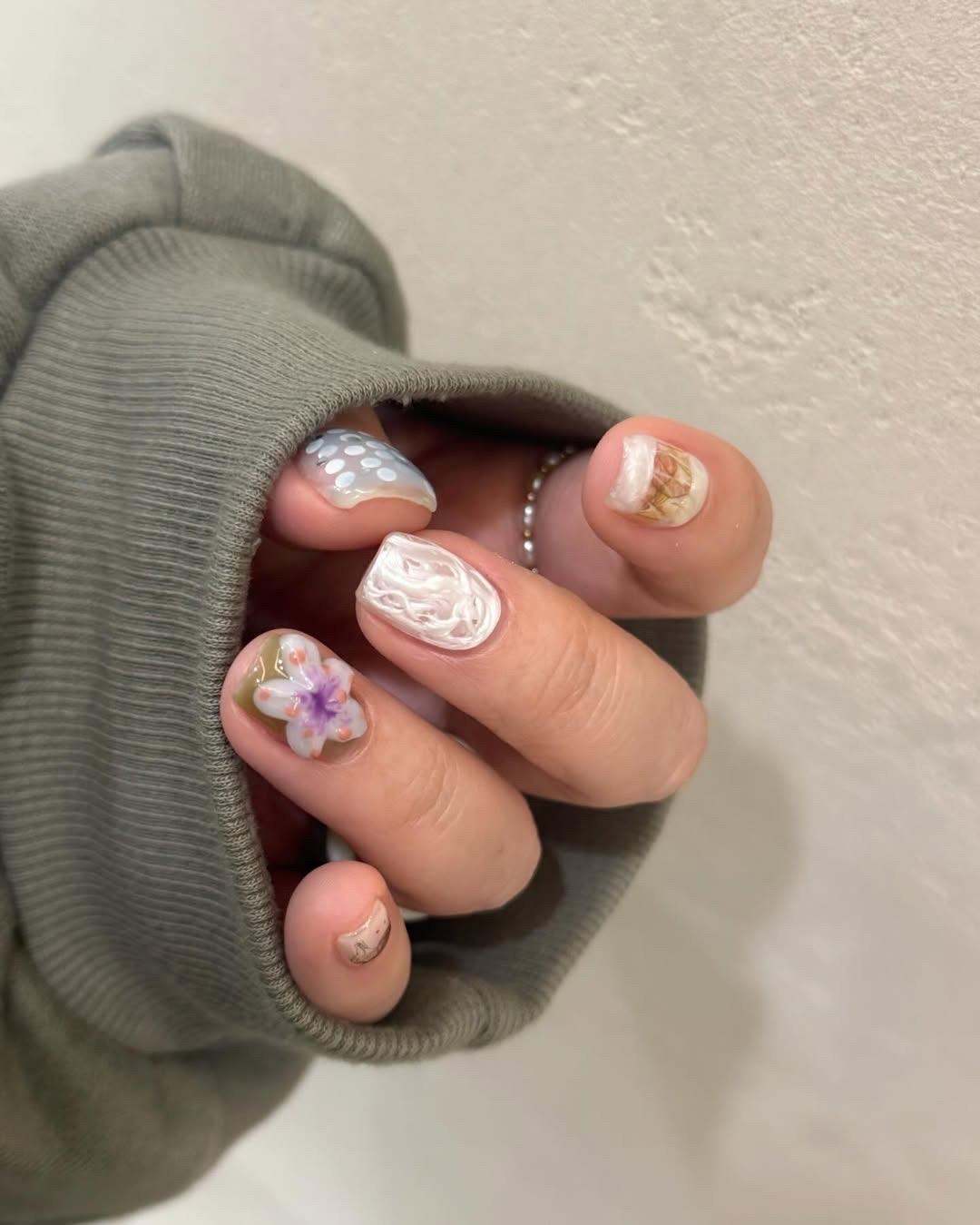 Кореянки любят делать самые разнообразные маникюры! Их любимый вариант включает разные дизайны на каждом ногте. Это может быть рисунок, выложенный кусочками глиттера, и объемный цветок, и необычное текстурное покрытие, и акварельная абстракция. Главное, чтобы все эти красивые нейл-арты сочетались между собой.