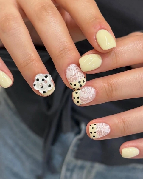 В этом маникюре сочетаются сразу разные виды дизайна. Тут тебе и френч, и горошек, и кружево, и черно-белый монохром. Все это особенно красиво выглядит в комбинации со сливочно-лимонным лаком в качестве основы. Это идеальный вариант маникюра для тех, кто хочет примерить яркий цвет, но желает смягчить его и сделать элегантнее.