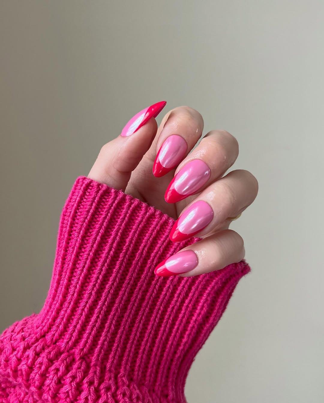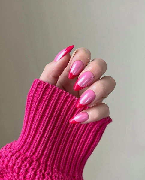 Еще одна смелая комбинация — яркий розовый маникюр с красными кончиками. Он очень прост в исполнении: нанеси лак, нарисуй френч — готово! Но что бы дизайн был еще круче, нанеси поверх жемчужную втирку. Она немного смягчит цвета, но не сделает их менее яркими.